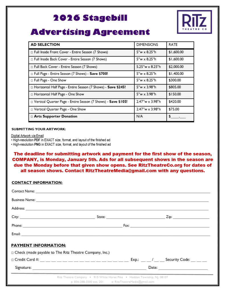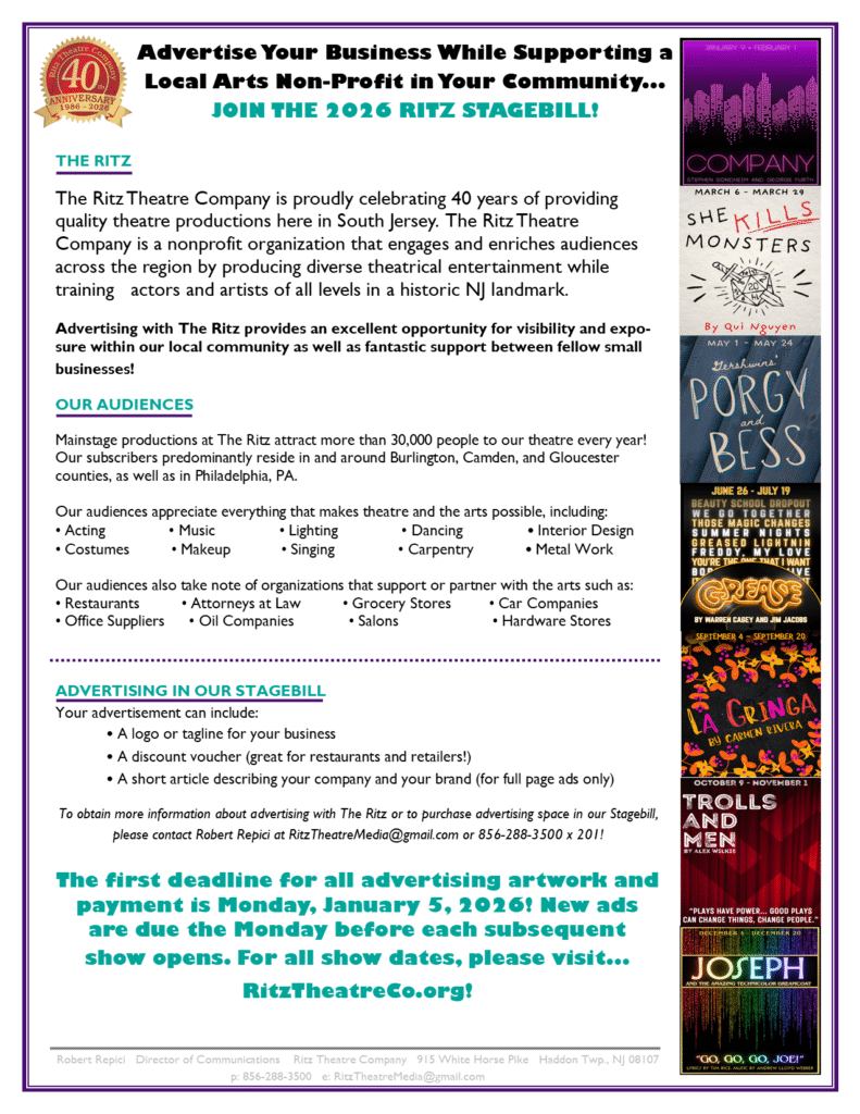In 2026, The Ritz Theatre Company proudly celebrates 40 years of bringing live, high-quality theatre to South Jersey—and we invite your business to join the celebration!
