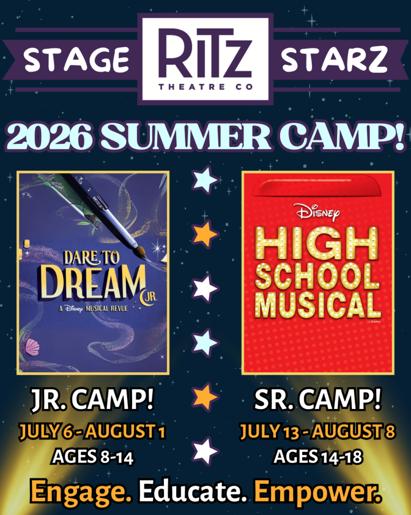 To apply for this special opportunity, please complete a camp registration form AND prepare a one-page letter specifically describing why you would like to be considered for this Ritz scholarship, what theatre means to you, and what your goals are for the future. Please send in your scholarship application with your completed camp registration form. Deadline to apply is May 31, 2026. Scholarship recipients will be notified on June 1, 2026.