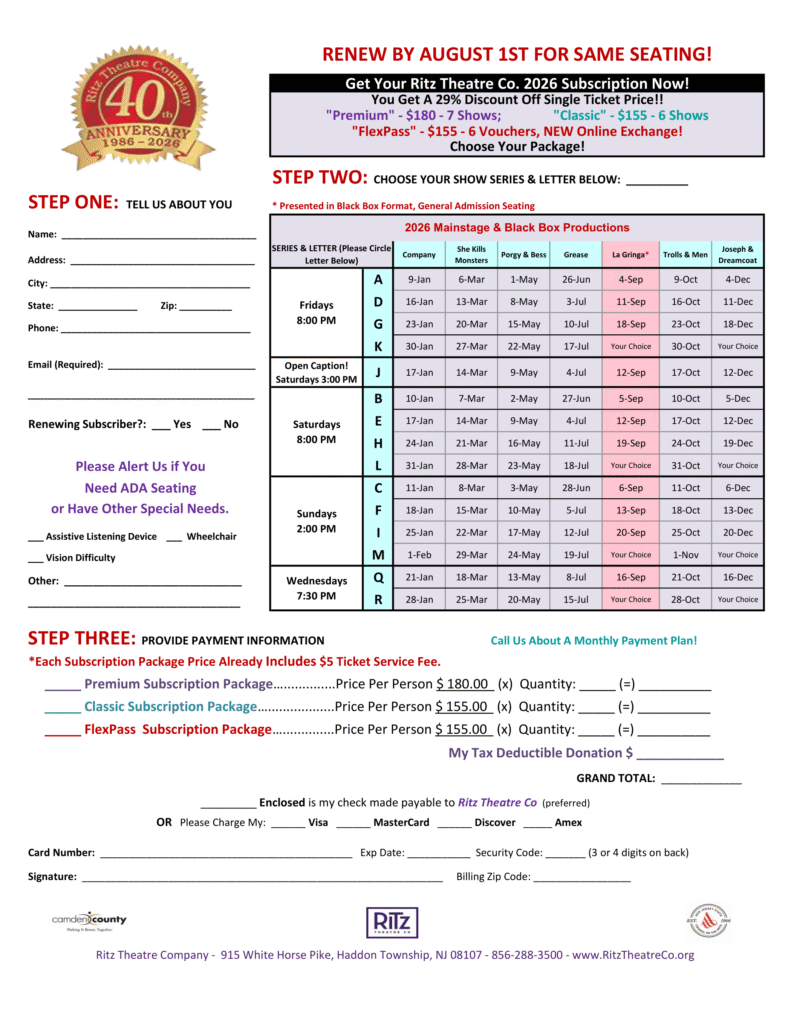 - Fill out the form (below) for the Subscription you want and mail it with payment to the Ritz Theatre Company, 915 White Horse Pike, Haddon Township, NJ 08107.